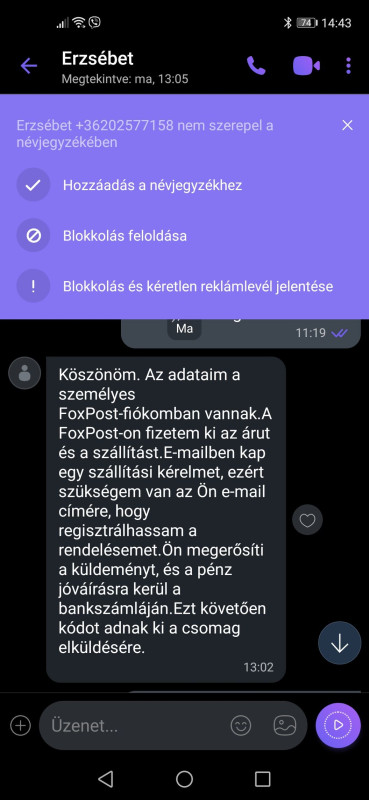 Erre visszaír, még mindig Viberen, hogy neki van regisztált foxpostja, abban benne van az adata, adjak én emailcimet és ő küld igényest.