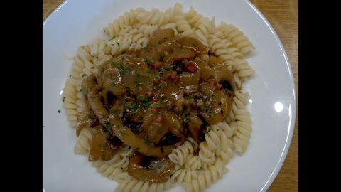 petrezselyem, metélőhagymaA hagymákat a baconön üvegesre pirítottam közepes-magas beállításon, ekkor mehet bele a gomba. Kb. 10 perc kell neki míg levet ereszt és kezdi elfőlni. Ekkor mehet bele a paradicsom. Kb. 5 perc mire az összes lé elfől és kezd a gomba barnulni. Ekkor mehet bele a liszt, pirospaprika és chilli.