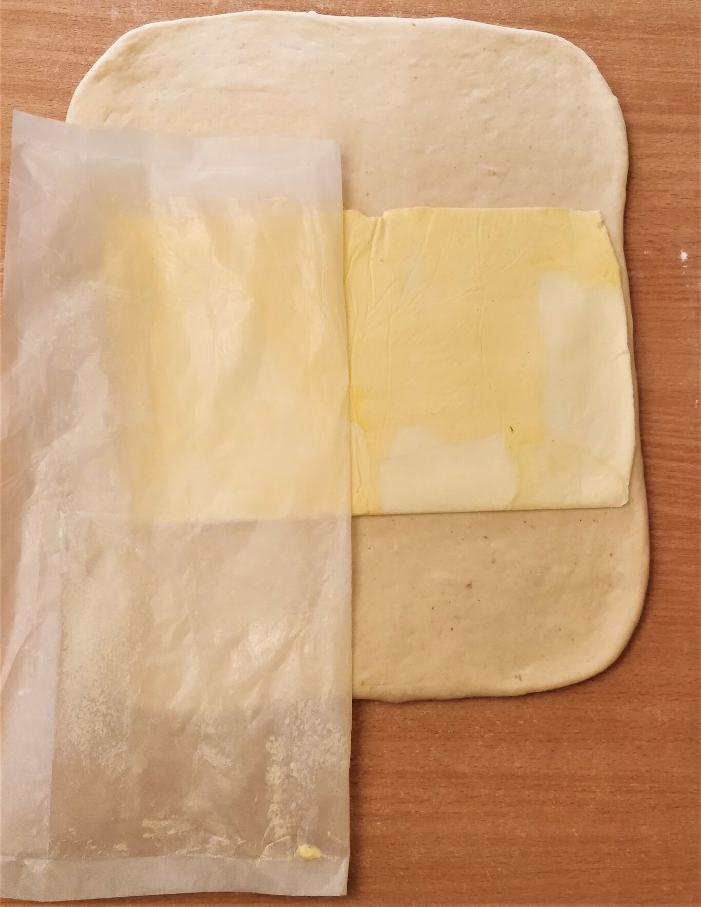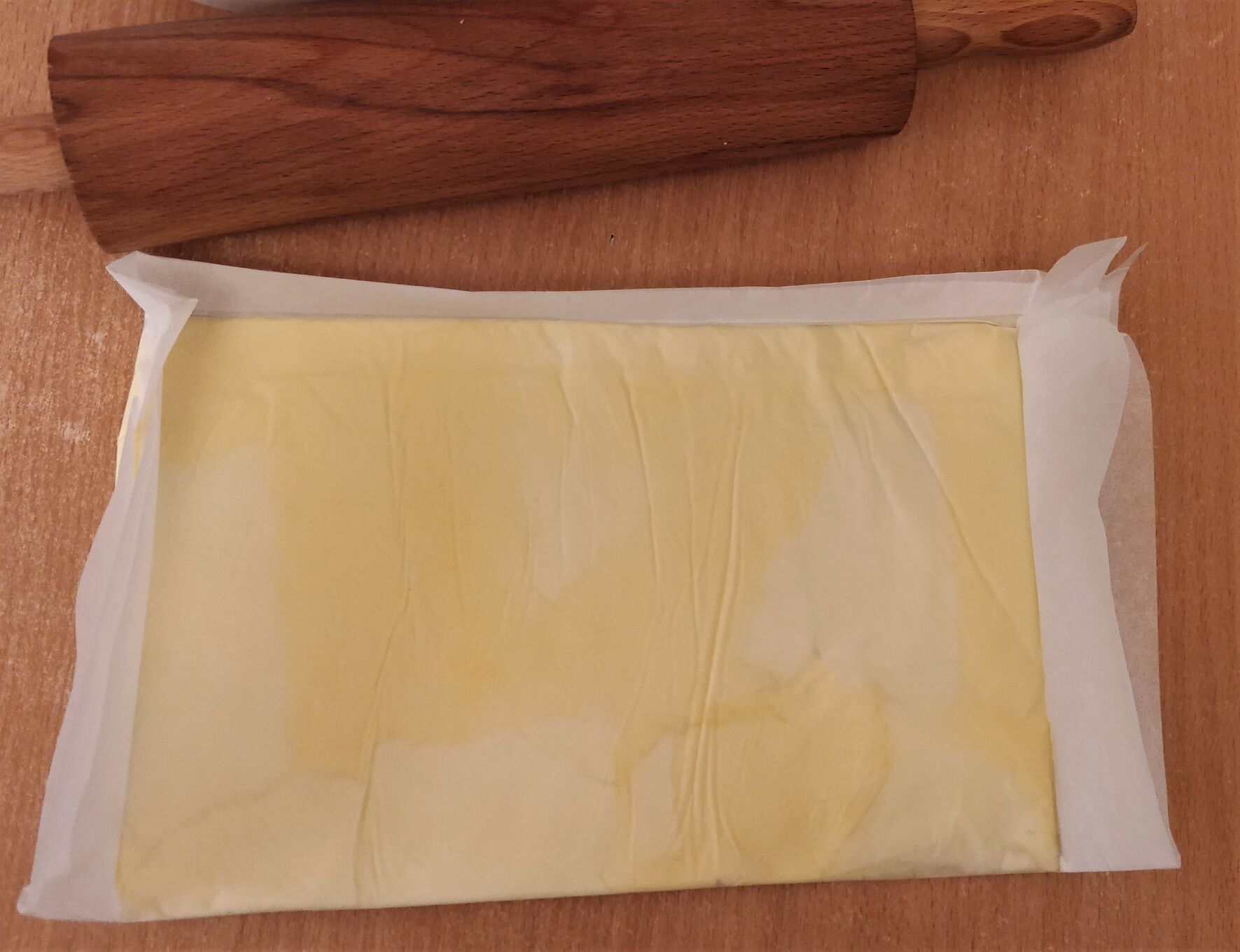 Amíg a tészta pihent a vajat sütőpapír között kinyújtottam, és betettem a hűtőbe: