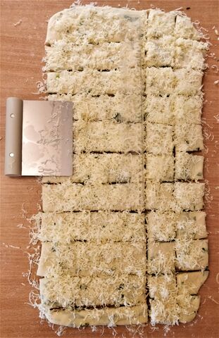 Majd megszórtam sajttal, most goudát és ementálit használtam. Ha nincs trokser, akkor pizzavágóval is lehet dolgozni: