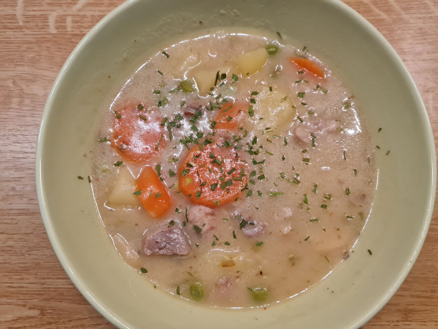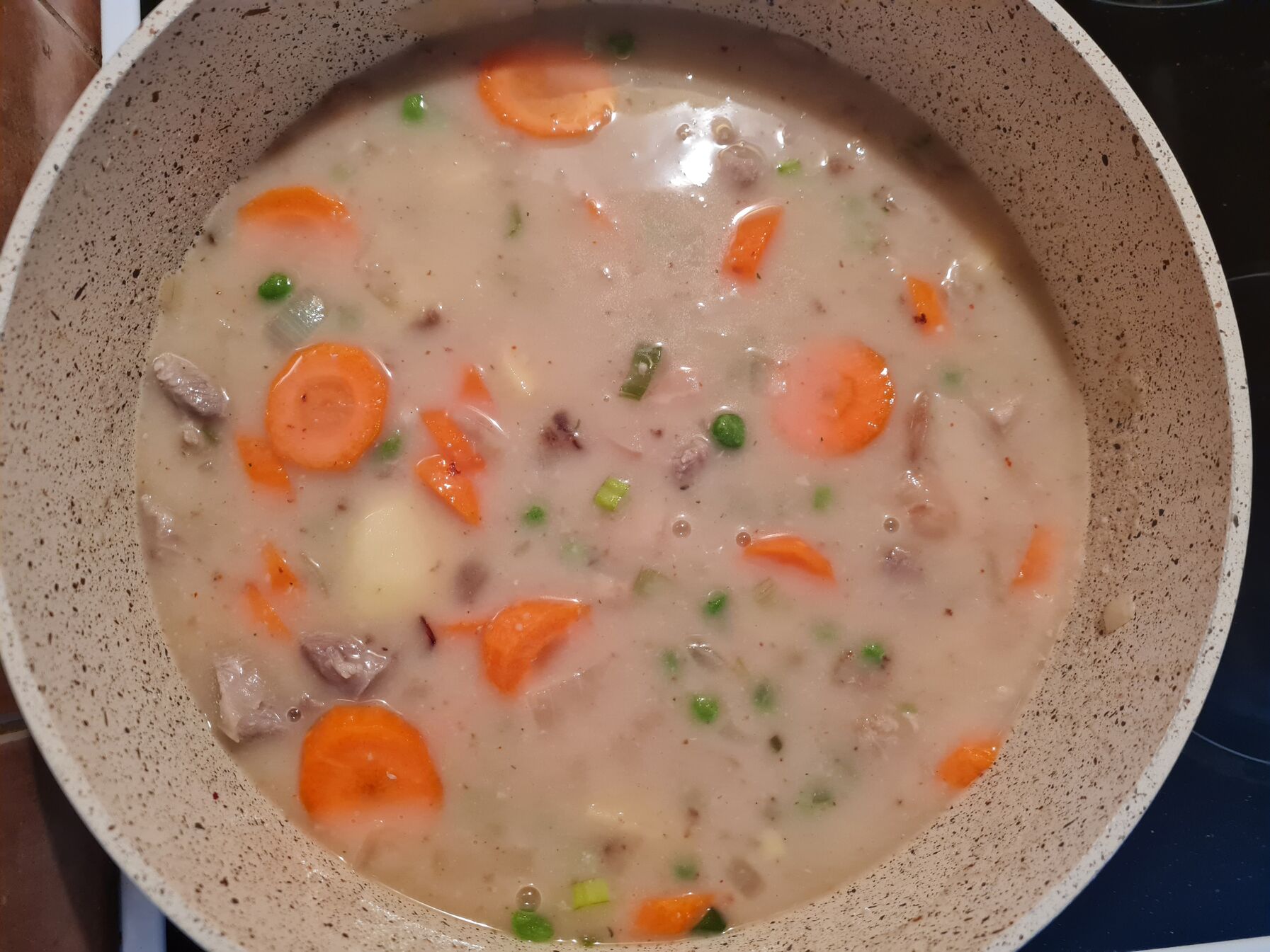 Mehet bele egyszerre az összes zöldség és én csak ilyenkor tettem bele a fűszereket is. Amikor újra felforrt, akkor fedő alatt kis lángon lehet főzni 30 percig. Közben párszor átkavartam, hogy nehogy a liszt miatt leragadjon.Nagyon egyszerű és gyors és laktató.