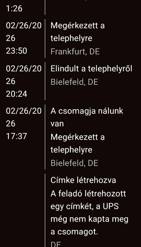 UPS-es tapasztalat. Tényleg futárfüggő lesz a dolog. Gumit rendeltem 2 hete pénteken, nálunk múlt héten ugye 23, 24-én nem volt munkanap, az UPS követési oldalán áttették a kézbesítés napját 27-éről 30-ára, füstölt is az agyam miatta, mert gumisnál volt időpontom, amit így lemondtam 27-én hétfőn. Fél óta múlva csörög a futár, hogy hozza a gumit...