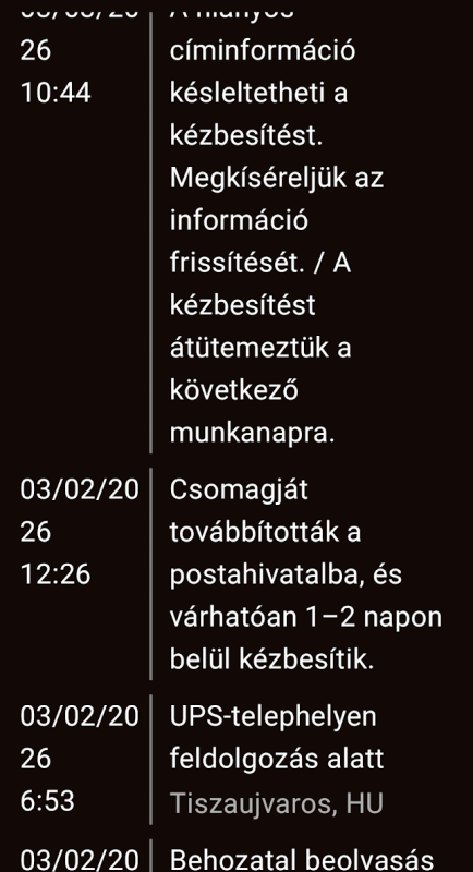 Nap végén jön értesítés, hogy el lett halasztva a kiszállítás, mindig 1-1 napokkal, kezd kicsit unalmas lenni.