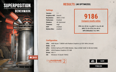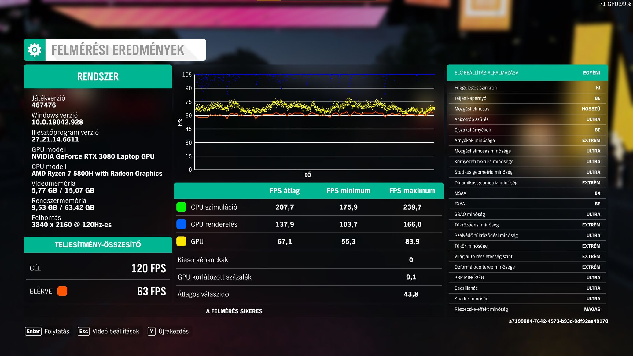 Szóval 150W 2080 + 9900KS -hez képest kb 2-3 FPS-el teljesített rosszabbul 5800H+3080 130W+Optimus.