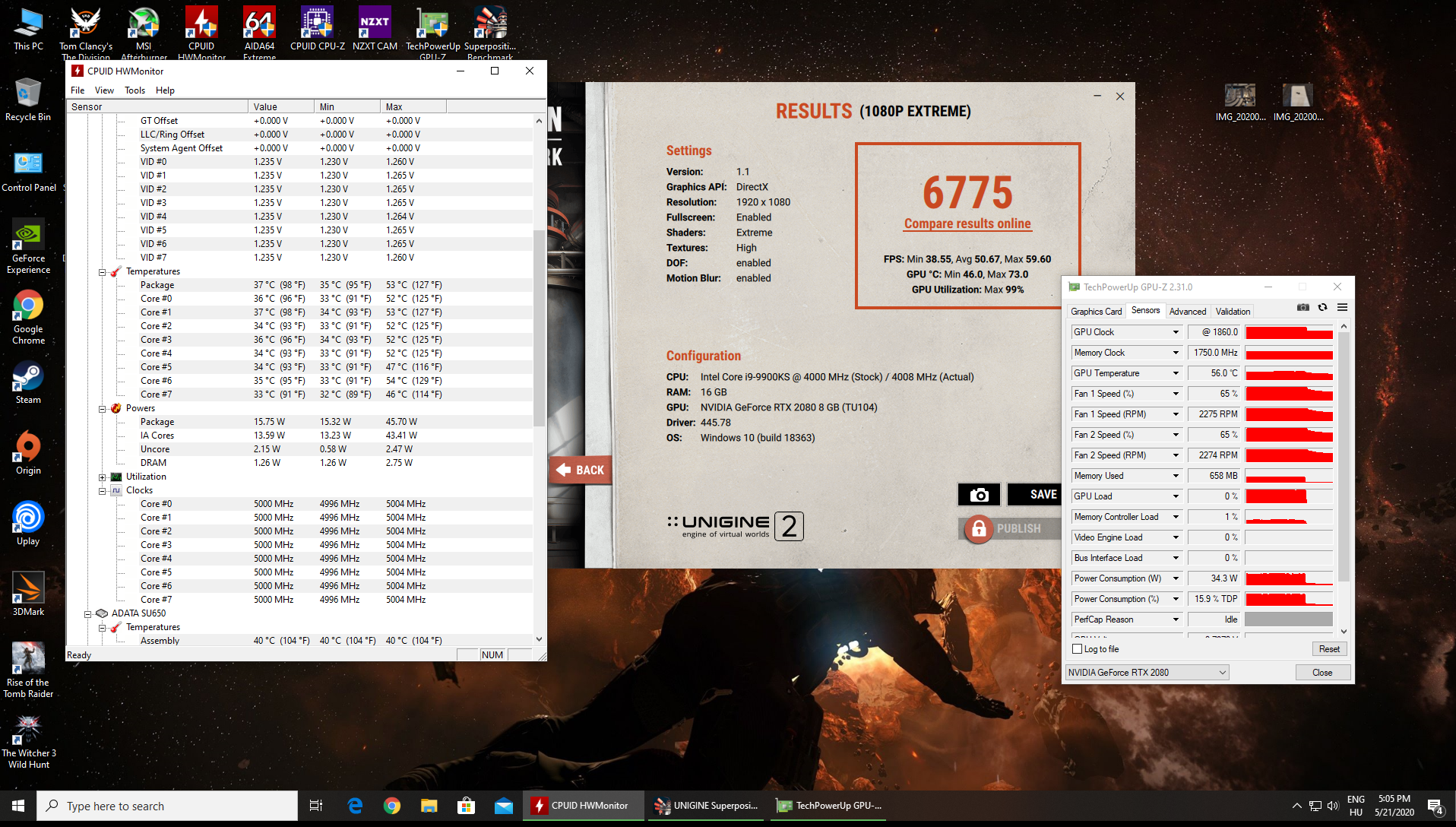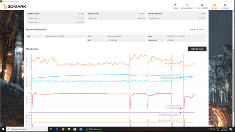 Asztali gép esetében 240W-ig ment el és az órajel 1860-1875 Mhz között mozgott.A CPU-t ne nézzétek, mindkettőben 9900KS van, de a laptopban gyári IHS-el szerelt van ami 4.6 Ghz-en fut, az asztaliban meg réz IHS-el szerelt deliddelt példány ami 5.0 Ghz-en fut, azonban most a vga teljesítmény a lényeg.