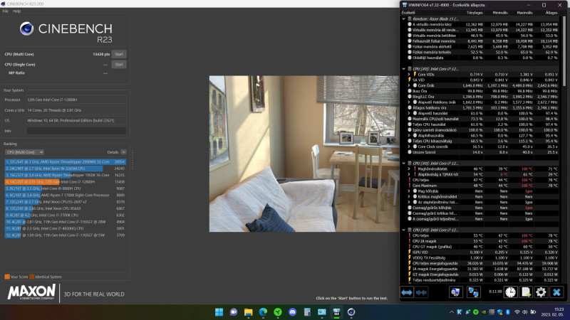 Minden basztatás nélkül. Egyrészt ez egy asztali gépben lévő 9900K eredménye, másrészt XTU-ban órákig finomhangolt proci fix 5,2 GHz-en, 201 wattos maximum fogyasztás mellett hoz 331 ponttal többet, mint az én az én 12800H-m, amivel annyit csináltam, hogy felnyitottam a laptop kijelzőt, betöltött a windows és elindítottam a Cine C23-at. Cserébe nálam a közel hasonló pontszámot tudta hozni átlag 2,6GHz (maximum 4,49 GHz) és átlag 59,9 watt (maximum 94,47 watt) fogyasztás mellett.