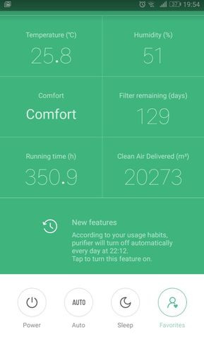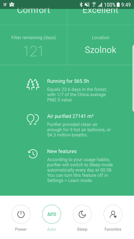 Könnyen kezelhető a saját alkalmazásából, folyamatosan mutatja a levegő szennyezettségét. Nálam eddig 90-es volt a maximum jelzés(portörlő rongyot megráztam előtte) 600 a felső határ amit kijelez. Porszívózás után felmegy 50-es szintig majd onnan egy fél óra alatt 10-ig levitte egy 47 köbméteres szobába a levegő minőségét. Van egyébként hozzá még zöld színű filter is az kiszedi a formaldehid maradványokat illetve lila az bakteriális szűrést is végez.