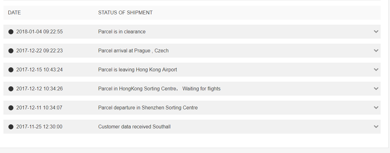 Az úton lévő eu expresszes laptopom jelenleg itt tart. Viszont itt más kifejezésekkel találkozom, és nem tudok párhuzamot vonni a telóm útvonala és eközött. Jó lenne tudni, mit jelent a legfelső sor, gondolom azt hogy úton van Anglián belül a következő állomásra (=Southall)? Illetve ha 12/30-án túljutott a vámon, akkor onnantól kezdve már csak beindul a mandula, igaz?