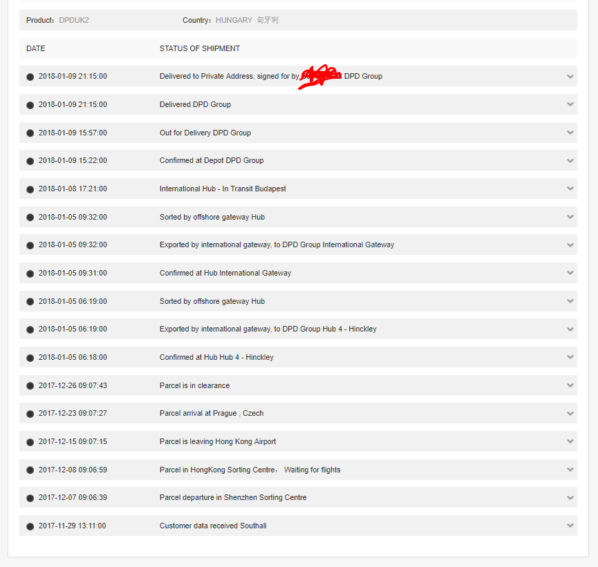 2017-12-04 23:22:00 Delivered to Private Address, signed for by -XY- Budapest