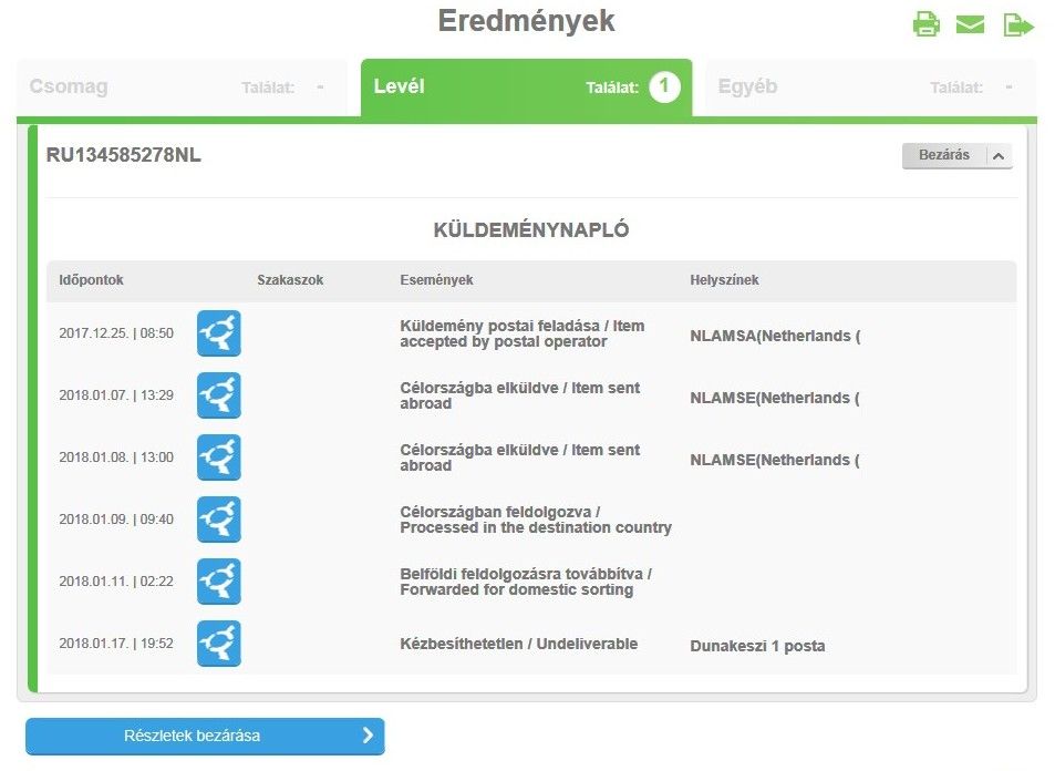 Az nálad igaz és nem tudja cáfolni, hogy a nyomkövetési információ nem tartalmaz olyat hogy szállítás alatt van, mert csak a felvételi vagy a nyomkövetésiszám leigénylési bejegyzés az kevés. -