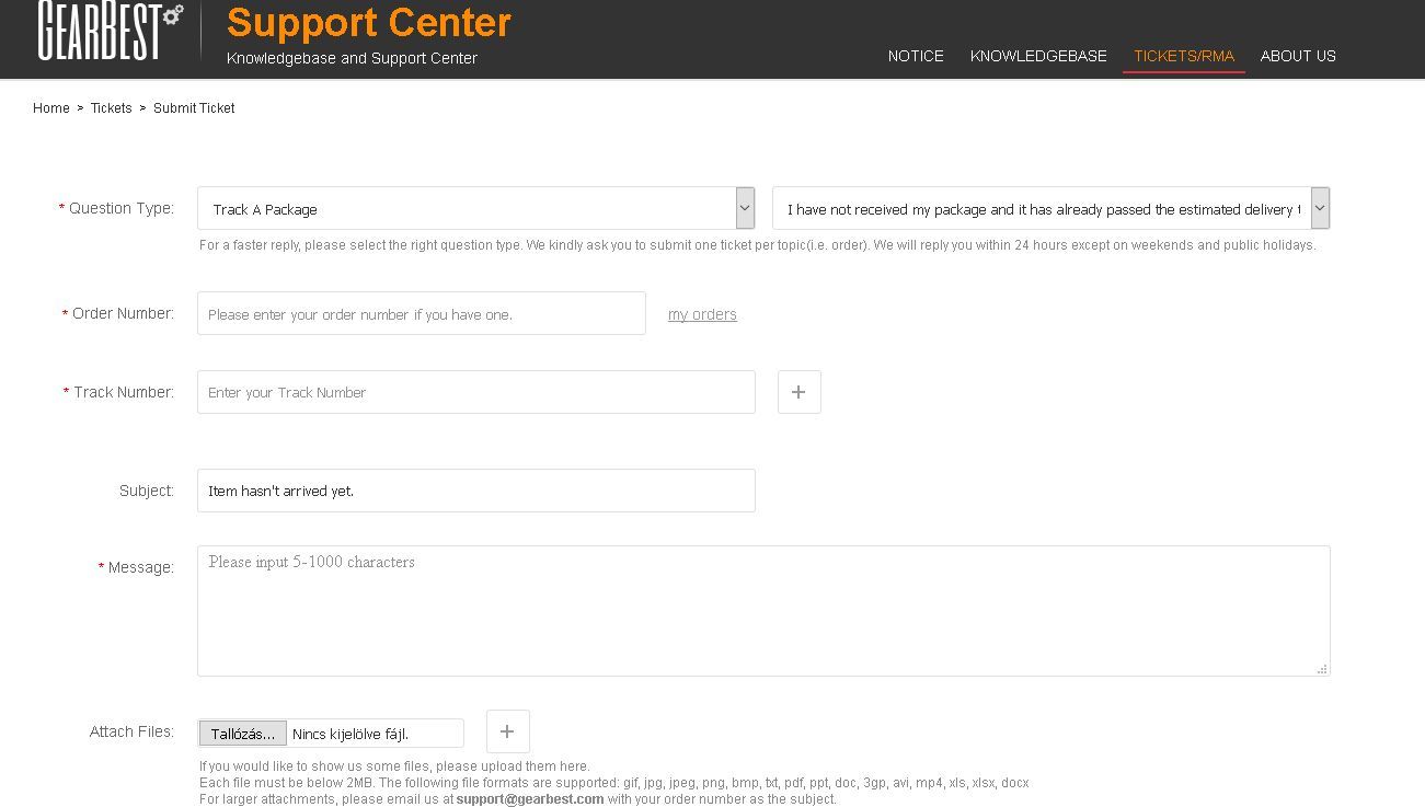 Egy ticketet akarok nyitni a Gearbest-en. Megadom:Question type: After-Sales Returns & Exchange, The item cannot be switched on.