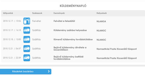Érdekes számomra,hogy esetemben a csomag már megérkezett országunkba de a posta oldalán még nem látszik ez ,nem frissült még. ( 2018-12-19 10:26:00 The item has arrived in the country of destination.)Last vessel