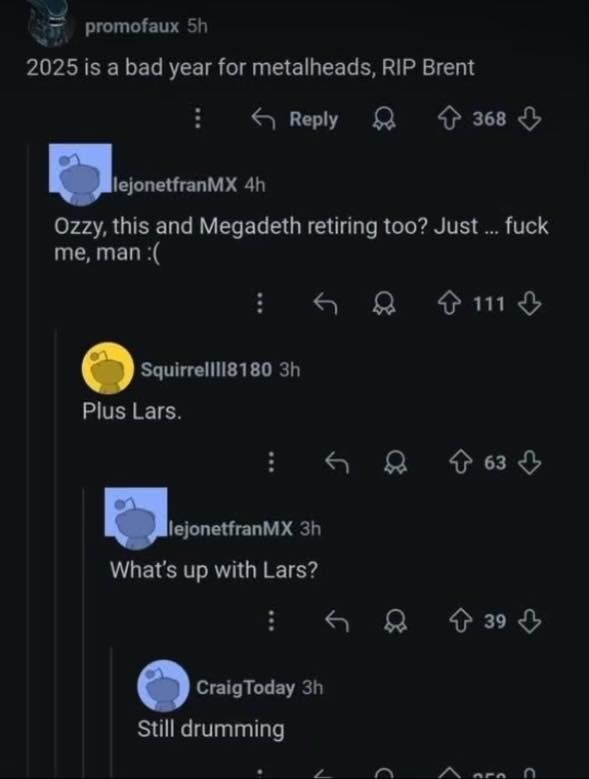 Egyetértünk, ha már nem tudja hozni azt a szintet (amit ahogy elnézve évek alatt összegyűlt "Lars fail compilation" videókat azért nem ma kezdődött és egyre rosszabb lesz) akkor fel kell tudni ismerni, hogy nem megy és tovább állni. Az alternatíva, hogy tényleg a banda nevéhez mérten összekapja magát. Mondjuk gondolom most már úgy van vele, hogy "valahogy kibekkeli" aztán mint eredeti tagként kerül be a könyvekbe "until the end of his career" címen.