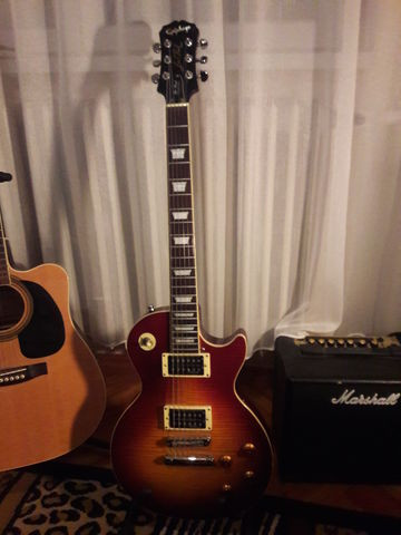 Nagyon bejön amúgy Epiphone Les Paul Standard, jó vastag test, bitang nehéz, van benne anyag bőven, serial number alapján 2004-es kínai, de nagyon szépen szól tisztán is, van egy kis minimális esztétikai hibája, de azon kívűl nagyon egyben van.