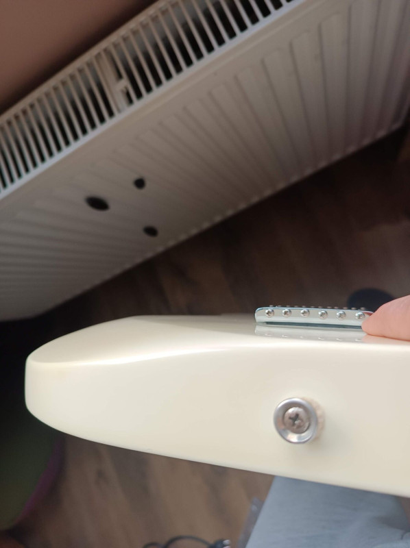 Még mindig tervezem a fehér Seymour Duncaneket beletenni. Csak az jöhet közbe, hogy nem fér bele, mert a Seymour Duncan trembuckereknél nem csak a húrtávolsaág a szélesebb, hanem az egész pickup. Szélesebb alaplapja van és szélesebb csévetestek vannak rajta. Aztán vagy belefér az üregbe, vagy nem. Az EVH Wolfgangomnál például kellett egy kicsit faragnom, hogy beférjen a TB6, de ott nagyon passzentos volt az üreg, és a gyári pickupnak is egyedi alaplapja volt.