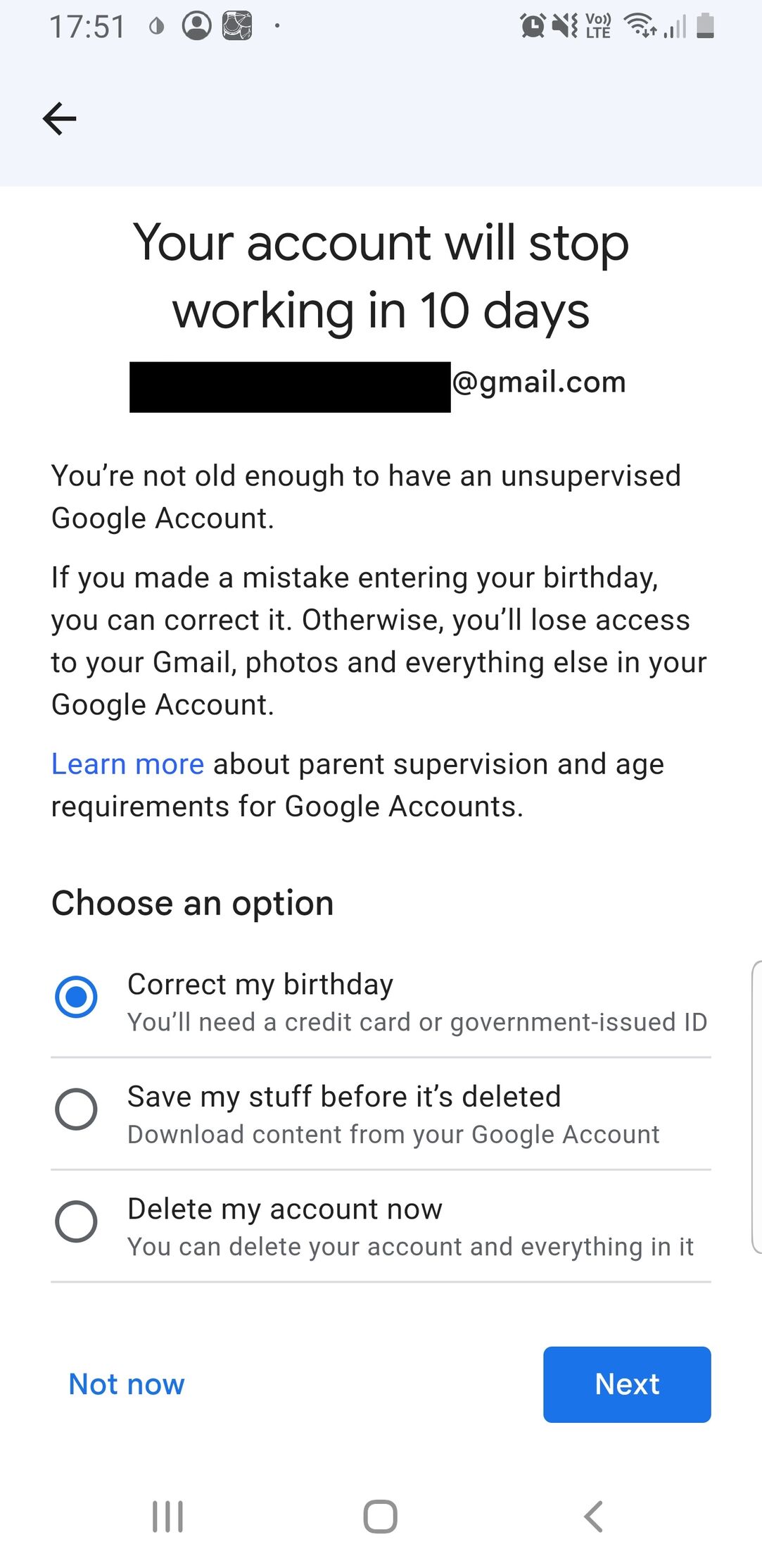 A gyerek accountján - egy app telepítése után, ahol meg kellett adni születési évet és a szülői felügyeletet - megjelent egy üzenet, hogy: "You're not old enough to have an unsupervised google account."bla-bla-bla, és most vagy küldök egy igazolvány képet vagy törlik az accountot pár napon belül. De minek ez, ha eddig bármit lehetett hasalni életkornak, és az én account-omnál sem kéri ezt?