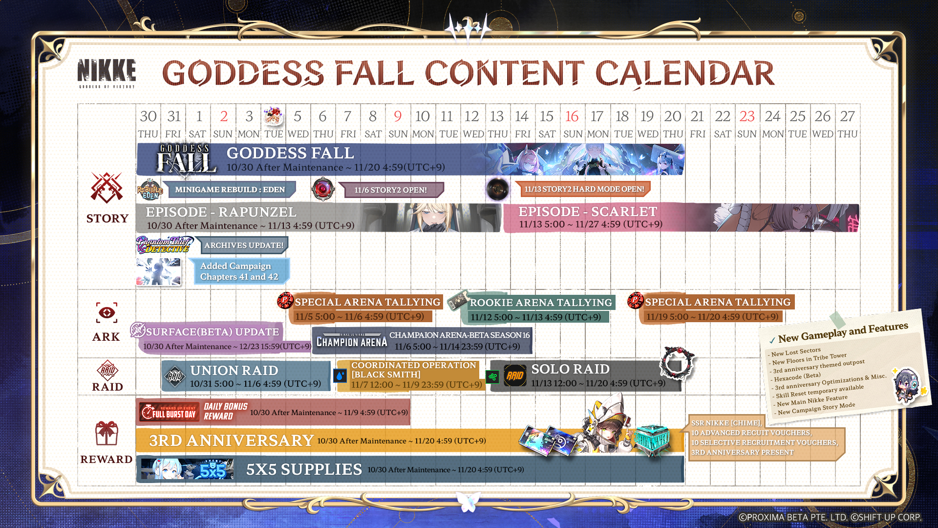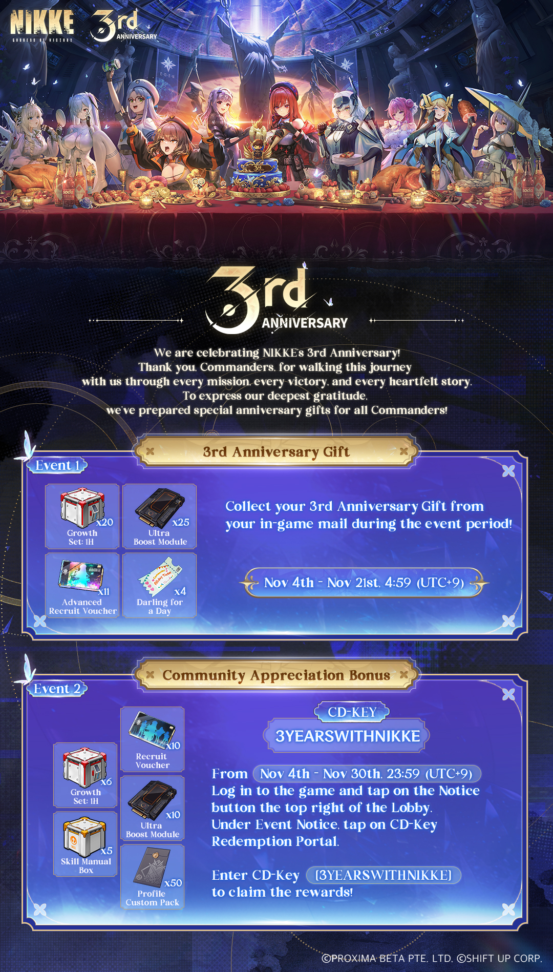 Bár a fejlesztők korábbi nyilatkozata szerint ez a 3 év még csak a felvezetése volt a fő sztori eseményszálnak szal el fog tartani egy ideig még ez.. '2027-ben jön a következő játékuk de az teljesen új játék lesz és nem Nikke alapú' -