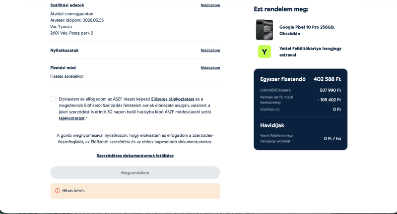 Van olyan aki rendelt mostanában a Yetteltől? Kártyás csomagban 402e a 256GB verzióért jó árnak tűnik, viszont bárhogy próbálom megrendelni az utolsó képernyőn hibát dob: