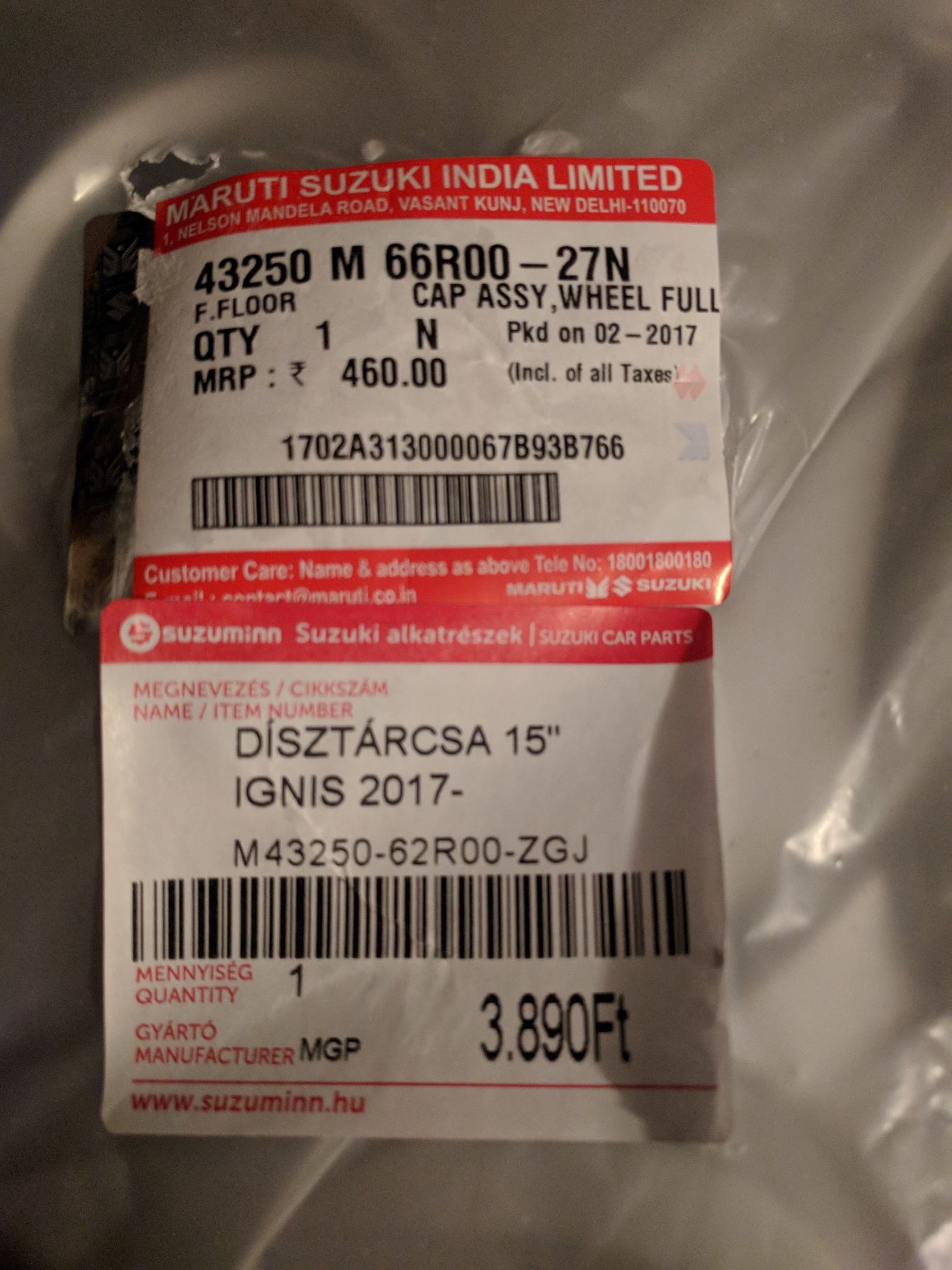 * = gyári új Maruti-Suzuki Genuine Parts. Az indiai ajánlott fogyasztói ára a dísztárcsának kb. 2000 Ft.