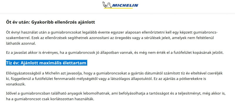 Forrás: Michelin - Tyre Aging (hivatalos oldal) (mondjuk ez a link pont nem él)– Itt leírják, hogy a Michelin abroncsok anyaga 10 évre van hitelesítve (megfelelő átvizsgálás mellett). -