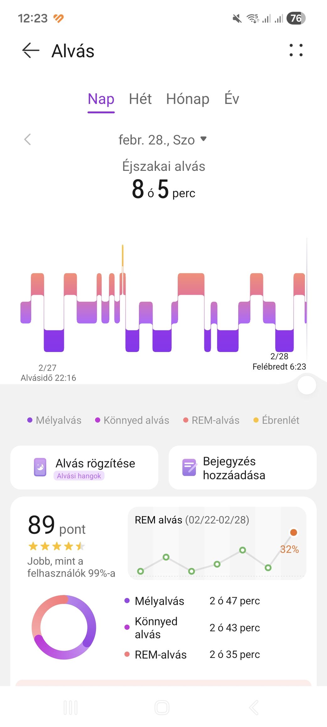 mély 2:15 körül, rem 1:50 körül.Ez már érzesre is jó, de jobban szeretem ha mindkettő legalább 2 óra és a mély kicsit több. Ha mindkettő csak 1,5 ott már érzem, hogy nem volt olyan jó. Aztán vannak ezek az extra jó alvások