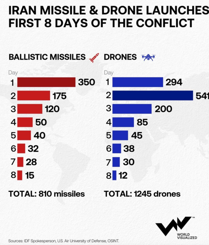 A csapásmérő készletek más tészta. Az USA főleg Tomahawk robotrepülőgépeket eregetett, ezekből viszonylag kisebb mennyiségben (30-50db) eregettek. Izrael csak az első nap 1200 bomba/rakéta csapást említett. Inkább tehát Izrael fogyhat ki a csapásmérő eszközökből (úgy tűnik, hogy igyekeznek minél rövidebb idő alatt minél nagyobb károkat okozni az Iráni harci eszközökben és katonai vezetésben, ha esetleg Trump hirtelen beszüntetné hirtelen az egészet).