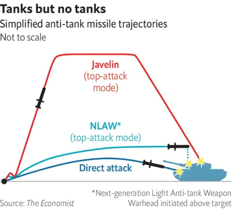 Ez a Javelin és az NLAV páncéltörő rakéta vázlatos pályája, nyilván stilizált, de a lényeget megmutatja: