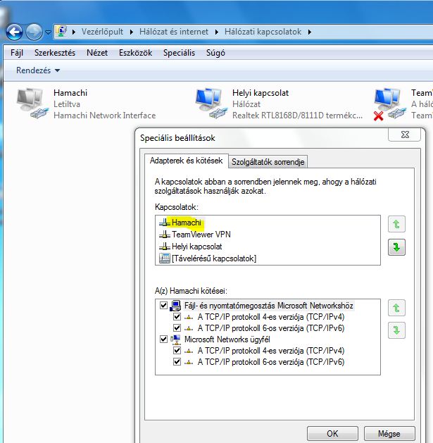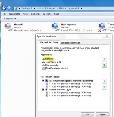 Azt már kipróbáltam, hogy a hamachi-s kapcsolatot tettem be az első helyre a sorban (prioritás szerint), de ettől sem lett jobb.