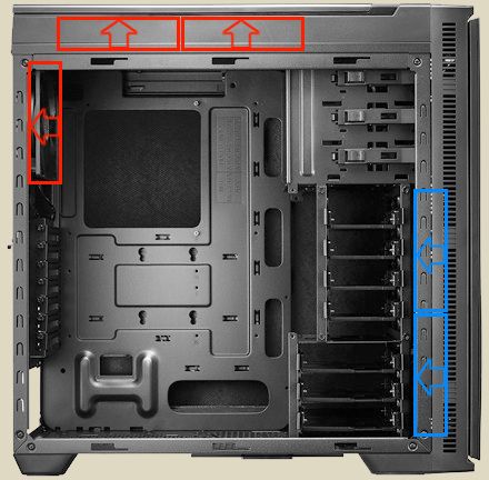 A hozzászólásokat olvasgatva egyre jobban kezd körvonalazódni, hogy is kellene a hűtést kialakítanom, de azért a végén majd lenne egy kérdésem. Íme az általam elképzelt legfrissebb verzió (Cooler Master Silencio 652S - felső SSD/HDD keret kiszedve)