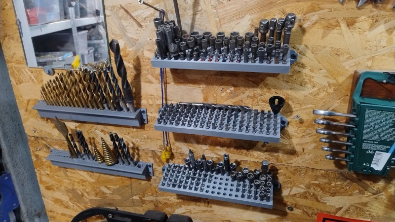 Alakult kicsit a műhely. Nincs még a helyén az összes apróság (ennyire volt időm a napokban), valamint még meg kell terveznem néhány további egyedi tartót is (Forstner fúróknak, a törtcsavar kiszedőknek, vagy pl. a lapos fafúróknak), de azért szépen lassan haladok...