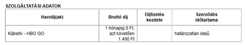"...6.3 A Felhasználó a díjat az HBO által a Weboldalon felkínált bármely módon kifizetheti. A Felhasználó vállalja, hogy aláírja a szükséges dokumentumokat és kellő fedezetet biztosít a számláján az egyes esedékességi időpontokban annak érdekében, hogy a Szolgáltatás díját határidőben megfizesse.