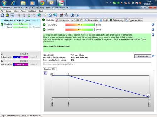 A napokban vettem egy hdd-t itt ph-n. 100/100%-ként volt hirdetve, volt róla hds kép is. Amint bettem a gépembe és tettem rá oprendszert feltelepítettem én is egy hds-t és már csak 100/99 volt. A képen látható működési idő és a nálam látható megegyezett, tehát a kép nem nagyon lehetett hamis. Azóta eltelt 1 hét, ismét ellenőriztem és most már csak 100/97 és a korábbi 2 helyett, már 5 gyenge szektor található. Kérdem én, mi okozhatja a gondot? A cuccaim a következők: ASUS P5K, Core 2 Duo E6750, 4x1GB Kingston DDR2 1066MHz, SAPPHIRE HD 5830 Xtreme 1GB GDDR5, GIGABYTE Superb 460W, Samsung HD502HJ 500GB