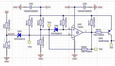 Viszont ha a TS391 IC-t felmelegítem, akkor a TP5 ponton felszökik a feszültség és így a kapcsolási pont is eltolódik felfelé. Csak a TP5-ön változik meg a feszültség, de akkor is, ha kiveszem az RX14, RX16-ot és átkötöm a két diódát.Van ötletetek rá, hogy mi történik az invertáló bemenettel melegítés hatására? 2 másik típusú komparátorral is ez van, abból az egyik szintén PNP tranzisztoros bemenetű, a másik viszont ismeretlen, az adatlapja nem írja.