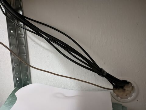 A gipszkarton falra fúrtam egy lukat amin átjönnek a kábelek a dolgozószobába: