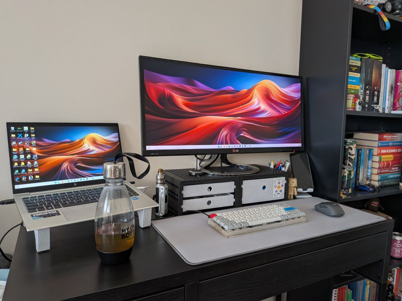 Nekem Type C-n csatlakozik, annyi hogy átalakítóval mert a laptopom HDMI foglalata behalt... majd egyszer kicseréltetem a szervízzel...A billentyűzetet asszem 2015-ben építettem, az egérpad Logitech Studio-s (idei beszerzés az M650 egérrel együtt). Jó vásár volt mindegyik, kényelmesek, kiszolgálnak rendesen. A többi 3D nyomtatott (monitor riser, laptoptartó és telefontartó)