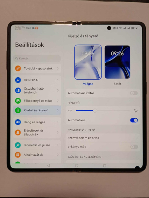 Vásárlás előtt - Samsungos lévén - a Galaxy Fold6-ot vártam nagyon. Tudtam a magic V2 létezéséről, csak akkor itthon még nem forgalmazták. Aztán egyszerre kijött a Fold6 és behozták a V2.. - t is. Beballagtam egy Telkom boltba, ahol közvetlenül egymás mellett volt kitéve a 2 készülék. Hát a Fold6 képernyői messze-messze alul maradtak. A V2 sokkal fényesebb és10-annyit sem tükröződik ellenfényben. Egyszerűen a papíron jobb, izgalmasabb Samu AMOLED képernyő elvérzett ez mellett.