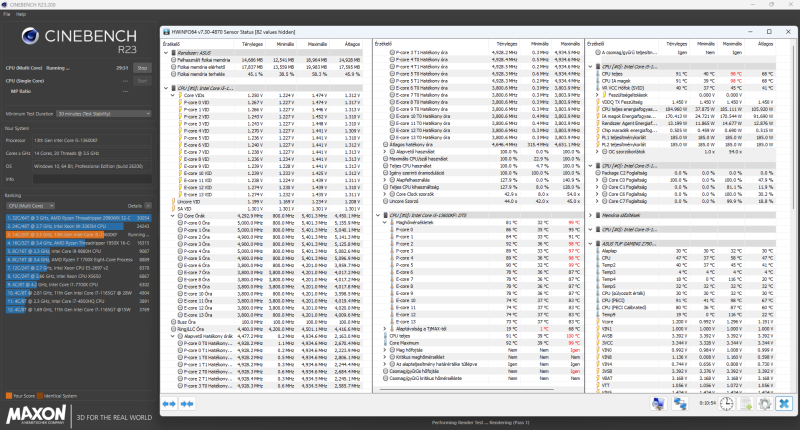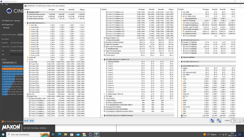 Az UV protect az XTU miatt lett bekapcsolva. Nem azt használom oc-ra, de kíváncsi voltam, hogy mit tud. Sokra nem mentem vele, de legalább megtudtam, hogy melyik a két preferált mag. R23-alatt stabilan 1,272V a vcore. A cpu teljesítmény 207-210W. Az órajelek is tartják az 5,1 és 4,1 allcore frekvenciát. Kicsit magasabb fesszel azért még a 230-al PL-be is beverte a fejét a teljesítmény, ugyanezekkel a freki értékekkel. Közben futtattam R23-at single core is. Eddig tényleg semmi gond. A 115°C határt lejjebb veszem. Néhány dolgot csak azért vettem fel maxra, hogy nehogy ezek okozzanak összeomlást, illetve ne nehezítsék a dolgomat. A V/F sort az alapján állítottam amiket olvastam ezzel kapcsolatban. Így tűnt ésszerűnek. Érdekes, hogy bár elméletben az N/A sorok nincsenek hatással erre a processzorra, a HWinfo így is -0,130V-ot jelez offsetként.
