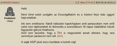 Értem persze,hogy mit mondasz.Mivel több darabban,részletenként került fel a gondom,megpróbálom összeszedni röviden a komplett történetet,így talán érthetőbb lesz,hogy miért is reklamálok.Már picivel több mint 10 éve vagyok Invitel előfizető.Mivel egy kis faluban lakom,nem volt,most sincs,és nem is várható konkurencia.Mindig is ez a 10 mega net+tv csomagom volt.Fejlesztés semmi nem volt a 10 év alatt,ezért 1-2 csatorna plusz,mínusz a tv-nél más változás nem volt.2 évenként újrakötöttem a dolgot,különösebben semmi gond nem volt.Mindig is két tv-m volt két beltérivel.A 10 mega internet mellett simán működött még plusszba a két tv.Így érkeztünk el kb másfél hónappal ezelőttig.Amikor is egy év hűség nélküli idő után,írtam egy mailt a központjukba.Taglaltam,példákkal,linkekkel alátámasztva feltettem a kérdést,hogy miért kell ennyit fizetnem ezért a csomagért.Pár hét múlva jött a levél,hogy méltányolják a leírtakat,és fel fog hívni egy kollégájuk,és felkínálnak egy egyedi árat.Ez másnap meg is történt.Úriember felhívott,megegyeztünk,hogy engednek 2 ezer forintot a havidíjból,és MINDEN MARAD ÍGY AHOGY VAN. Ez a beszélgetés alatt többször elhangzott,hogy addigi meglévő csomagom fog tovább élni,egy kedvezményesebb áron.A csomag aktiválása után pedig az történt,amit már fentebb taglaltam.