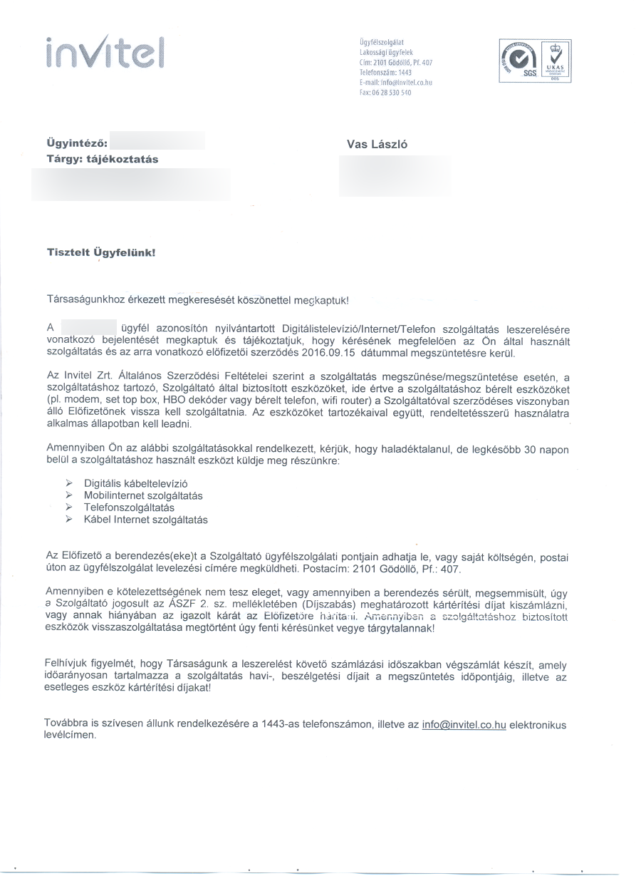 Az Invitel által számomra kiküldött hivatalos tájékoztatás a leszerelésről I.