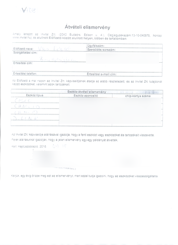 Az eszközök leadásáról szóló, az Invitel Pontban az ügyintéző által adott átvételi elismervény