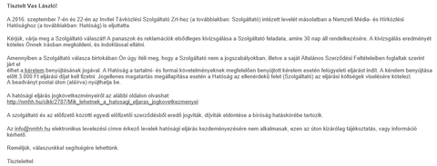 "az általam előterjesztett beadvány nem tartalmazza a hatóság döntésére való kifejezett kérelmét", de ha 15 napon belül kifejezetten kérem, hogy járjanak el a szolgáltatóval szemben, akkor átteszik az NMHH-nak.
