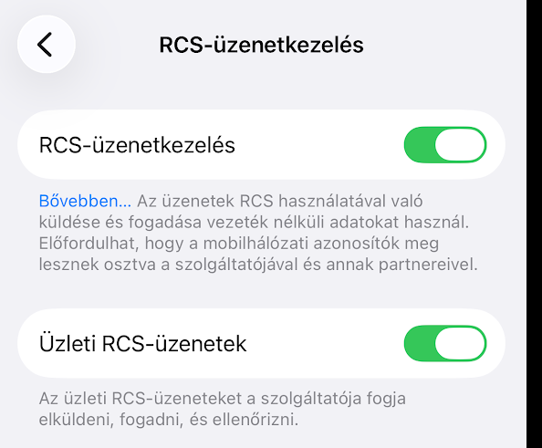 Kölcsön kértem a kolléga céges Samsung (valami alsó középkategóriás) telefonját és alapértelmezetten be van kapcsolva az RCS. Az én céges Vivomon is be van, de az Google Messagest használ üzenet küldésére.