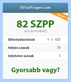 De eleg zavaro, hogy a szavak kozott nem a gepeles ritmusaban lepked, hanem lemaradva, ettol korrigalasbol nyomok me'g valamit... na meg az ertelmetlenseg is, meg az egymas utan ugyanaz, ki tudja melyiknel tartok. Ebben talan hosszu i nem volt, azt csak hosszabb szoveg utan szokom meg, hogy ranezes nelkul hol van. Viszont 3-4 visszatorles kellett. Ektelen magyarul is megprobaltam, allitom hogy gyorsabb lennek, de mivel a hiba bezavar, nem lett jobb.