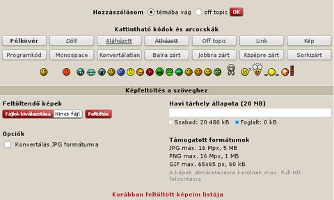 Segítséget kérnék ez ügyben: nem tudok képet beszúrni privát üzenetíráskor. A kép beszúrást nyomtam meg, mert nem jelenik meg a "Képfeltöltés a szöveghez". Emiatt nem jön be az a kis ablak, amin keresztül kijelölhetném a képfájlt a gépemen lévő mappákban. Nem tudok tallózni. Csak egy sáv jön be, ami valamiféle linket kér. Próbáltam elérési útvonalat bemásolni, de nem jártam sikerrel. Mi változott? (régebben ment a dolog).