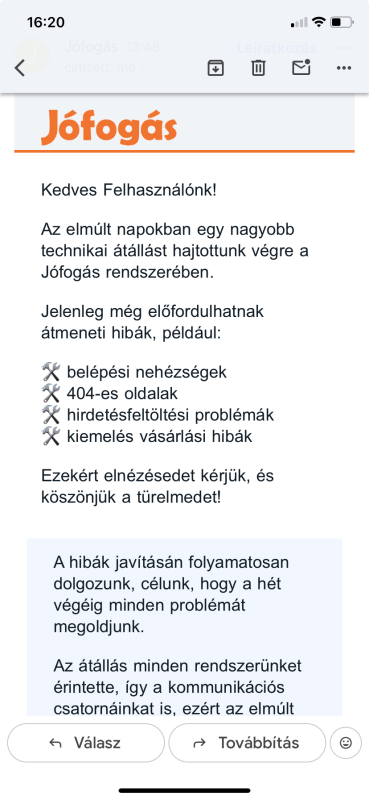 Egy hirdetést adtam föl, melyre írt valaki a Jófogás rendszerében, így néz ki az üzenet."