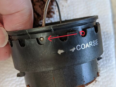 No itt van a kosár beállítása, a karika jelzi a gyári állapotot és a lekopott FINE felirat irányába léptettem kettőt (piros nyíl mutatja). A kosár kis drót fülének a vége a COARSE felirat O betűje felett volt gyárilag.