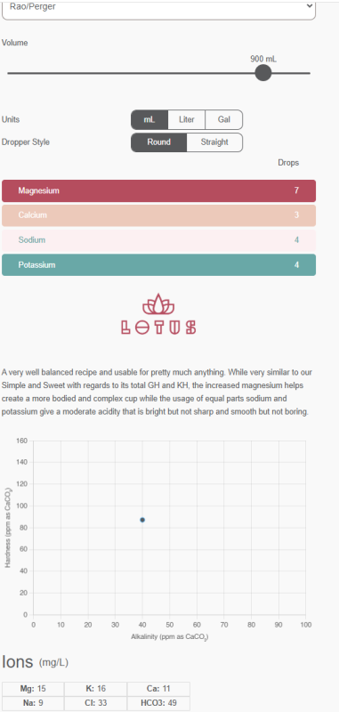 ...szerintetek működhet olyan tök egyszerű módon is, hogy mivel a Rao-Perger konkrét receptje meg van, a két lotus drops recept arányai alapján "eltorzítom" a R-P receptet? (Azaz 33%-kal kevesebb magnéziumot, ugyanannyi kálcium, feleannyi szódát és feleannyi káliumot teszek bele, mint amit a R-P recept ír?)