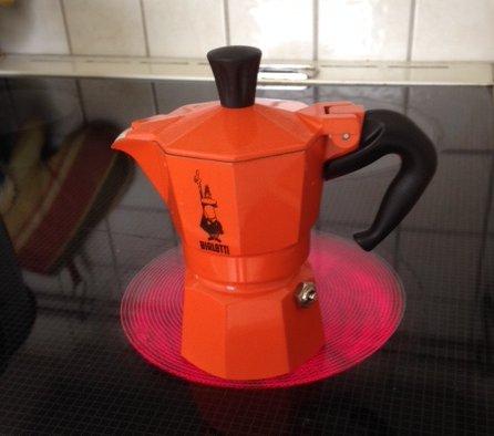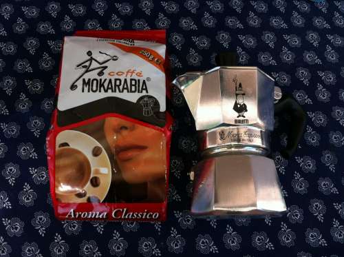 Friss őrlés, nem túl finomra, nem túl "menő" de minimum Crema e Gusto, kávéból, rádobom a kemping főzőmre, és elég intenzív lángon két percen belül lefő. Nincs semmi égett íz, semmi savasság, amit pl. szüleim rozsdamentes 4-6 személyes kotyogóinál utálok.És tényleg cuki, tenyérnyi holmi.
