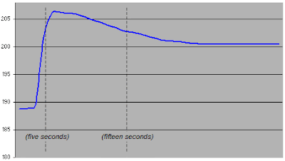az emelkedő majd csökkenő fejhőmérő-hőfok megvan, gondolom a hőcserélő bojlerben lévő részében felforrósodott víz miatt emelkedik az elején, aztán amikor az elfogy és már hidegebb víz jön a tartályból, akkor kezd el csökkenni.