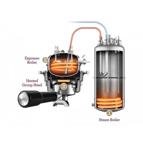 Az 1-es a gőzbojler, ez felel a gőz és forróvíz/teavíz előállításáért, a 2-es a fejbojler, ez a kávéra kerülő vízért, a 3-as pedig a fejfűtés. Az ilyen rendszerű gépeket T3-as rendszerűnek nevezik. A gép legnagyobb technikai előnye, hogy mindhárom rész pid-vezérelt. A kávéra érkező víz hőmérsékletét beállítod, akkor az elektronika a fej és a kávébojler hőmérsékletét azonosra fűti. A gőzbojler hőmérsékletének beállításával pedig a gőznyomást tudod beállítani. Illetve még egy okos megoldás: ahogy a képen látszik a stabilitás érdekében a kávébojler a gőzbojleren keresztül kapja az így előmelegített vizet (rézcsőtuningos Gaggia